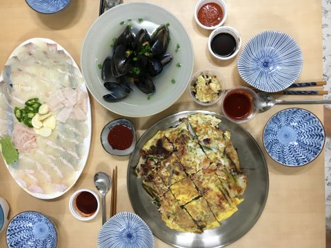신랑이 좋아하는 회를 주고 홍합탕과 해물파전을 득..