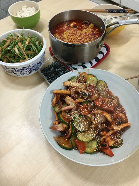 불맛나는 오징어볶음에 돌나물 무침이에용 ㅋㅋ 라면은 옵션