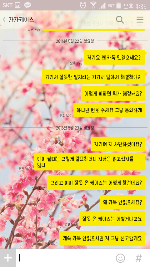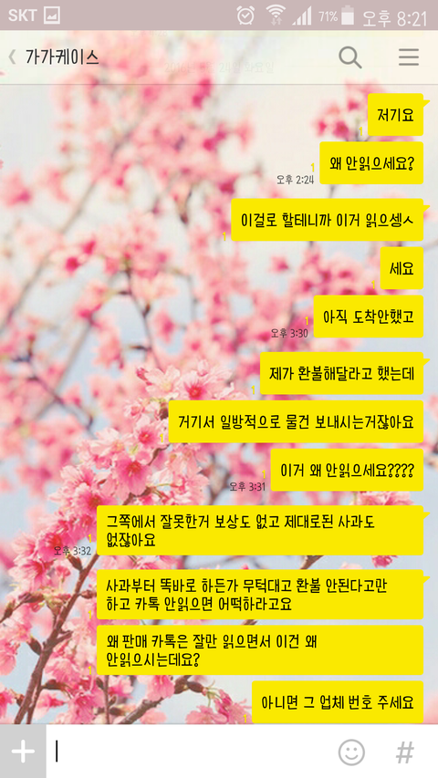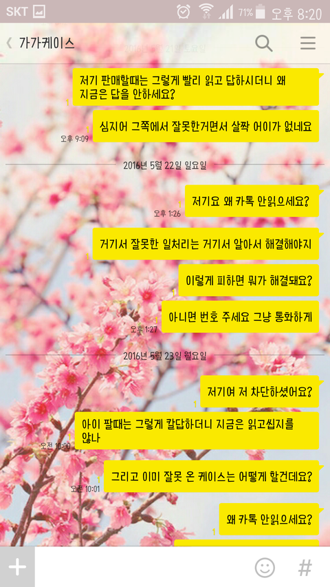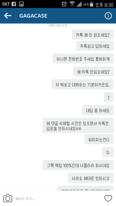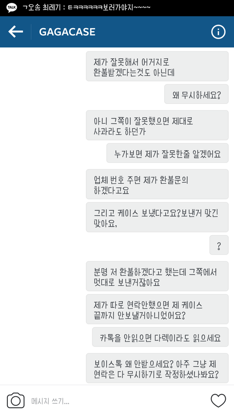 제가 친구와 함께 가가케이스라는 인스타에서 케이스를 파는 판매자에게 케이스를 구매했습니다. 배송온걸 보니 제가 산 케이스는 오지 않고 친구가 산 케이스 두개 중 하나는 다른 디자인으로 왔습니다. 그래서 환불해달라고 했더니 처음엔 알겠다하더니 다음날에 환불 안된다고만 해서 이유라도 말해달라하니까 카톡 읽씹하고 토요일에 다시 보내니 그때부터 지금까지 쭉 제 카톡을 안읽습니다. 제가 잘못해서 환불받자고 하는 것도 아닌데 계속 연락을 안받으니 답답해 미칠 것 같습니다. 하도 카톡을 안읽어서 인스타 다이렉트를 보냈는데 그것마저 무시하더군요. 그래서 인스타에 댓글 달았더니 그거 삭제하더라고요ㅋㅋㅋㅋㅋㅋ어이가 없어서ㅋㅋㅋ그래서 댓글 삭제할 시간에 카톡 답장 해달라하니까 그것마저 삭제했습니다. 어쩌자는건지.. 심지어 친구폰으로 문의하는 척 카톡 보내니까 그거 답장 하더라고요. 그래서 제가 제 카톡 안읽어서 친구폰으로 카톡했다하니까 다시 안 읽습니다. 신고하겠다 카톡해도 절대 안 읽습니다. 네이트판에 올려서 인터넷에 퍼지면 혹시라도 답장이 올까 올립니다.