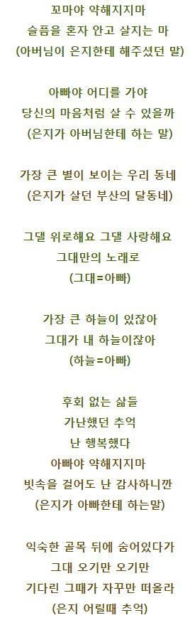 들으면서 가사에 '아빠야'라는 가사가 있기에 노래는 못하지만 아빠한테 들려주면 좋겠다는 생각이 들었어