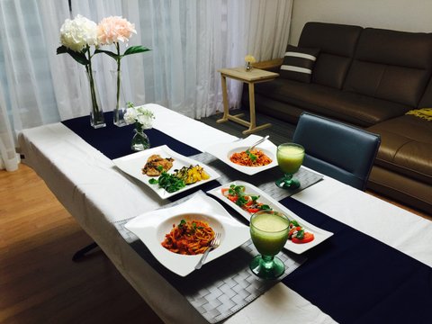 거실에 테이블펴놓고ㅋㅋ 파스타 닭가슴살스테이크 카프레제샐러드에용ㅎㅎ