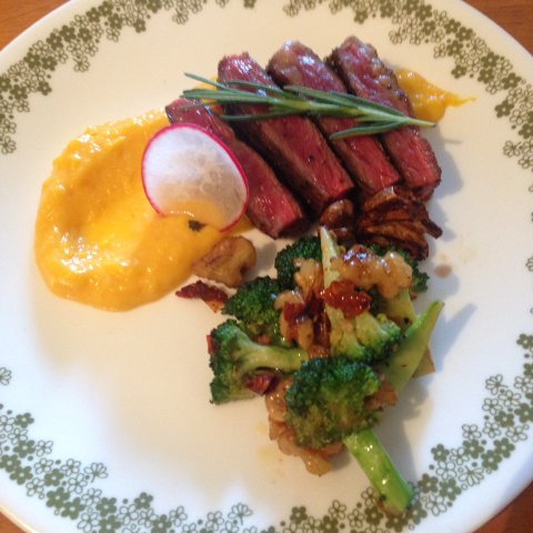 1. 단호박 퓌레를 곁 드린 스테이크호박을 쪄서 우유 넣고 믹서로 갈아주고 설탕이랑 버터 넣고 끓여서 만들었어요.믹서기가 오래 된 거라..입자를 곱게 갈기는..힘들어서 굵직굵직 하네요.