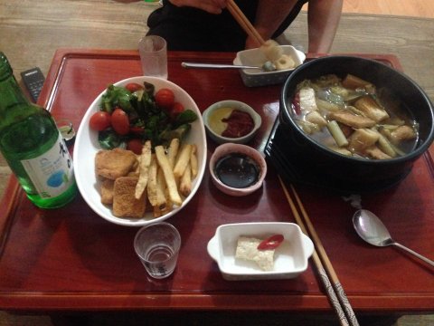 탕수육은 중국집에서 시켜먹고 남은 탕수육을 냉동보관하다가 후라이펜에 기름두르지 않고 약불로 뚜껑 닫고 적당히 굽고 소스는 간장 식초 설탕 쪼끔씩 그리고 청양고추 홍고추를 기름에 볶다가 넣고 소스를 만들었습니다.
