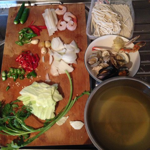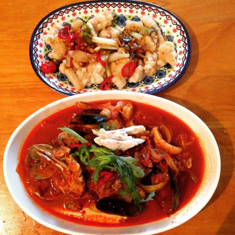 오징어와 새우는 따로 조리 할때 볶아서 넣어주었고 육수를 내었던것들도 함께 넣고 볶아주었습니다. 볶을땐 두반장과 고추가루 굴소스를 넣어주었습니다.