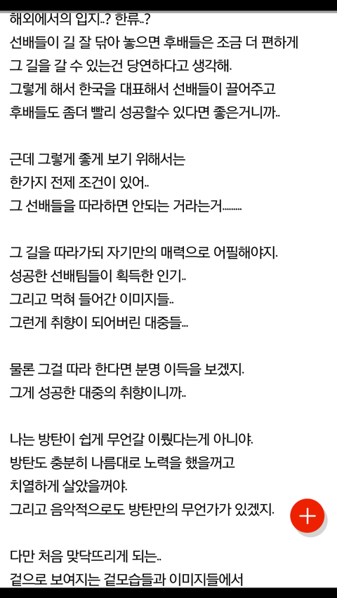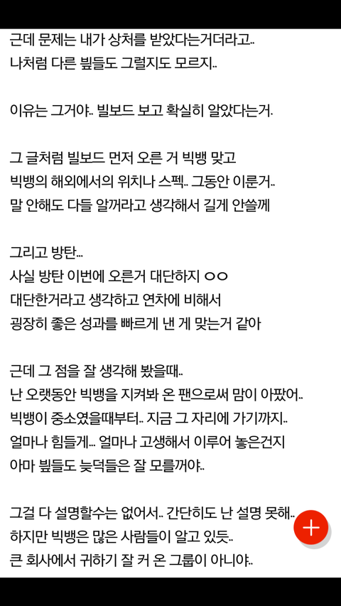 ...이거 기억나 다들? 울 애들이 ㅂㅂ 컨셉이랑 스타일링 따라해서 외국에서 인기 얻었다고 맘 아프다고 한 글? 마치 우리는 아무 노력 없이 단순히 해외에서 인기 많은 선배 가수 좀 따라해서 쉽게 인기 얻고 올라간 것처럼 쓴 저 글. 난 진짜 아직도 이해가 안 됨. 외국 사람들이 방탄을 보고 오! ㅂㅂ이랑 스타일링 비슷하네! 노래 들어볼까? 이러면서 방탄 노래 찾아들었을 거라는 저 갖잖은 논리. 빌보드 메인 차트가 그렇게 쉬운 차트인가ㅋㅋㅋㅋㅋㅋㅋㅋ노래는 좋아서 듣는 거지 자기가 좋아하는 가수랑 컨셉이나 스타일링이 같다고 듣는 게 아닌데. 해외 사람들이 우리나라 사람들이랑 같은 취향일 수는 없는 거 아닌가? 그리고 해외 사람들이 ㅂㅂ 분들 스타일링이랑 컨셉 때문에 노래 듣는 건 더더욱 아니잖아? 저건 오히려 ㅂㅂ 분들의 음악적 능력을 팬들 스스로 까내리고 있는 거 아닌가? 그리고 저거 말만 나 슬퍼...이렇게 써서 잘 포장한거지 결국 성공한 선배 팀들이 얻은 인기를 방탄이 날름 먹었단 소리 아님? 진짜 난 이 글 보고 기분이 너무 엿같았어. 우리 애들이 음악 잘 만들어서 해외 인기 점점 많아지고 빌보드 메인차트 연속으로 두 번 들어간 거. 이건 오로지 애들이 이룬 성과지 누군가의 스타일링이나 컨셉을 따라해서가 아니었다고. 애초에 따라한 적도 없지만. 방탄이 미친듯이 노력해서 얻어낸 성과를 이런 감성팔이 글로 까내리려고 했던 게 난 아직도 화가 나. 그래서 난 이 글 링크도 저장해놨음 ㅇㅇ 난 생각날 때마다 저 글 보고 다시 생각할 거임. 방탄을 위해 더 꿋꿋이 살아야지. 그래서 함께 더 높은 곳으로 올라가야지. 애들의 노력을 모두 폄하하고 끌어내리려 했던 저들의 손이 닿지 않을 만큼 높이.