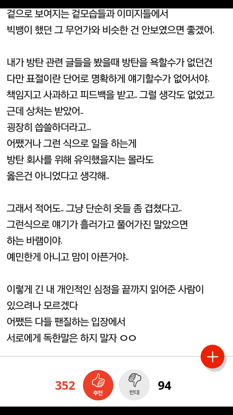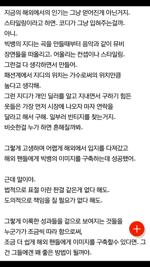긴 글 읽어줘서 고마워. 그냥 이렇게라도 얘기해보고 싶더라. 이삐들 언제나 방탄을 위해 싸워줘서 고맙다. ...난 아미들 말 보고 솔직히 감정 상했다... 실트 사건도 정말 안타깝고 표절이라 몰아붙인 건 정말 내가 대신 미안한 일인데 나는 진짜 실트도 안했고 표절이라 말 안하고 그냥 가만히 있었거든? 그냥 나중에 제대로 된 결과 나오면 그때 가서 판단하려고. 근데 이렇게 아미들이 빂하고 빅뱅 까내리고 보니까 글쓴이 의도는 빅뱅 스타일링을 따라해서 떴다 이 요지가 아니라 빅뱅을 따라해서 뜨는 건 좀 우리로서 기분이 안좋다 이건데... 저 글을 보고 자기들 마음을 더 다지겠다는게 더 화난다 어떻게 태도가 저럴수있지? 빅뱅 노력은 1도 생각 안하고 자기들 까내린다고만 판단하고 날름 먹었다고 욕한다고 판단하는거. 얘들아 이걸 봐서라도 우리 좀 더 마지막까지 힘내고 애들 상 다 받고 꼭 마지막까지 행복할수 있도록 해주자 저런 감성팔이 글로 까내리는게 아니라 빂이면 알지만 나도 정말 처음부터 함께 해 온 빂으로써 저런 아미들의 생각과 태도를 보고 좀 충격도 먹었달까... 사실 나도 초등 중등때는 내가 화내면서 논리적인 듯 겉으로 말하고 쓰고 했을땐 뿌듯했는데 지금 생각하면 정말 한심하고 내가 논리적인 척 했던게 부끄러웠던거... 쟤들도 나중엔 느낄 수 있겠지? 그리고 표절이라 한 건 미안한데 두세번도 아니고 겹치는게 수많은데 그 모든걸 흔하다, 우연이다라고 넘기기엔 흔하지 않은 옷도 있고 한 콘서트 옷을 다 가져간 것도 있고 아직도 생각하면 속상한데 아미들이 많으니 딱히 뭐라 할 수도 없고, 너희들도 한창 공부할 나이라 바쁠테고 어린 애들처럼 우리 옛날처럼 불러모아서 요즘 말로 화력? 그런거 보여주는것도 유치하고 그냥 이 판 접으려고... 나도 판 하면서 참 이런 팬들도 있다고 생각했다. 몇년을 함께했지만 정말 느낀것도 많고 이런 타팬들도 있다는거에 좀 기분이 안좋더라저런 애들 때문에라도 마지막까지 힘내서 애들 위해 노력해야겠다. 얘들아 힘내자..!!