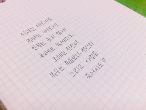 베플 말이 딱 맞아 알바 찾을 정도로 존잘까지 못 돼 잘 쓰는데 특이한 글씨체면 생각해볼 수도 있는데 딱히 특이하진 않은 거 같아.. 그냥 평범한 블로거들이 다이어리 리뷰할 때 쓰는 글씨체임 다이어리 전문 잘나가는 블로거들이 협찬받아 쓸 정도가 아니고 그냥 잡다한 것 리뷰 쓰는 10대 블로거들이 자기 돈으로 다이어리 사서 리뷰 쓰는 정도? 나는 잘 쓴다는 소리 듣는데 한글은 다른 애들이랑 비슷해 보이는 거 싫어서 일부러 연습 많이 해서 좀 특이하게 쓰고 영어는 유럽 쪽에서 태어나서 살다가 와서 필기체로 씀 근데 난 글씨 쓰는 걸로 돈 벌 생각 해본 적 없음ㅋㅋㅋ 말이 안 돼 글씨 써봤자 얼마나 잘 쓴다고.. 캘리그라피는 이미 글씨의 수준이 아니고 거의 그림 같음 실제로 캘리그라피처럼 일상 글씨 쓰는 사람도 못 봤고