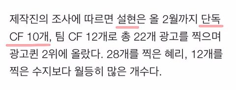 광고 갯수, 몸값, 재계약율 어느 하나 설현이 수지를 따라올 수 있는 부분이 없는데도 어떻게든 수지 한번 이겨보겠다며 조작까지 해대는 fnc 언플에 기가 찰 지경