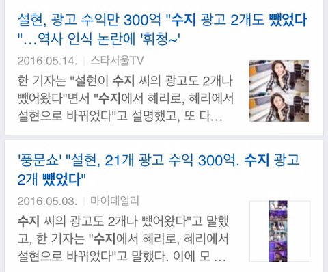 심지어 수지>다른 연예인(바비,강소라)>설현 순으로 캐스팅 된 광고임에도 불구하고 수지 광고를 설현이 뺏었다는 식으로 기사를 씀