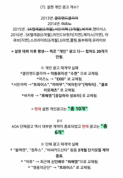 설현 역시 단독으로 찍은 광고는 10개밖에 안 되는데도 AOA가 지금껏 찍은 모든 단체 광고를 합해서 설현의 "개인" 광고인 것처럼 방송 됨