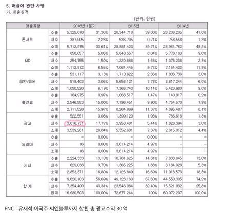 fnc소속 연예인인 유재석,이국주,씨엔블루 등을 모두 합친 국내 광고수익이 30억인 FNC.
