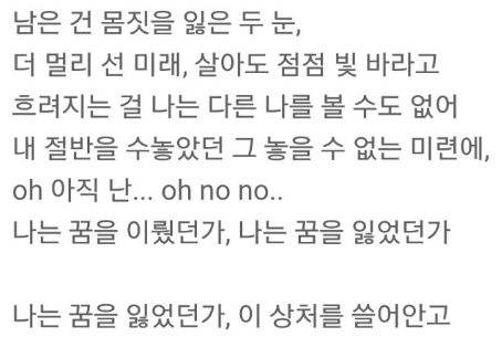 그 다음은 지코의 '꿈을 이룬 건지 꿈을 잃은 건지' 그리고 슈가의 '지금 난 꿈을 이룬 건지 아님 꿈을 잃은 건지 아직 잘 모르겠어 내가 성공의 꿈을 미룬 건지' 이 두 가사다