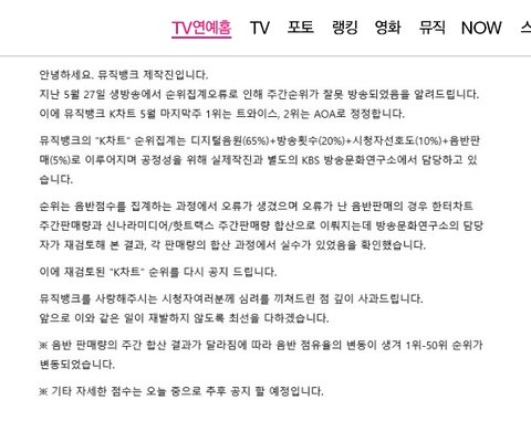 뭐...당연한거지.. 사실 뮤뱅측에서 잘못한게아니라 왠지 조작 한 건데 반발이 심해서 뮤뱅이 뒤집어 쓴 것같은 강력한 느낌이 들긴 하지만; 아니겠지뭐ㅋㅋ