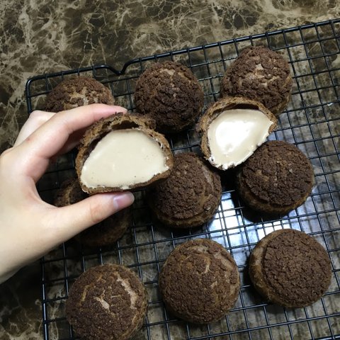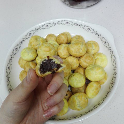 ' 시판과자 홈런볼 ' 이건 베이비슈 반죽을 작게짜서 안에는 가나슈 채워 넣었어요 ! 슈가 작다보니까 가나슈 짜는 구멍이 작아서 힘들었어요 .. 중간에 터지고 난리났었어요