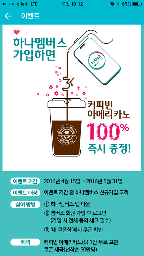 친구가 알려줬는데, 하나멤버스 가입하면 커피빈 1잔 공짜래~~