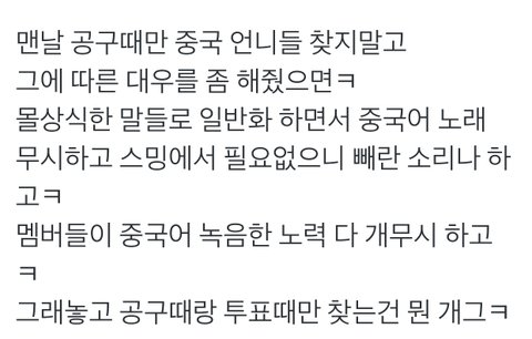 일부팬들 일반화 시키기 오지구여ㅋㅋㅋㅋㅋㅋㅋㅋㅋ중국어도 스밍돌리는 팬들도 몇명있을텐데 왜 다안하는것처럼 말하냐 씹씽이마누라야^0^