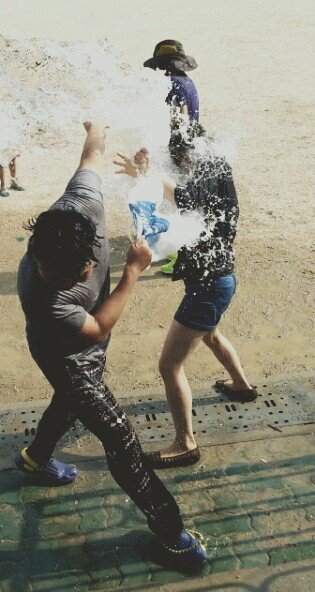 어머니들도 같이 빈 패트병으로 물싸움도 하고