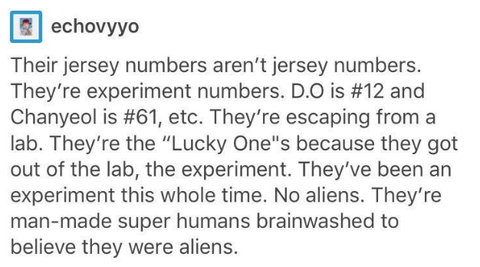 유니폼 번호는 사실 실험 번호. 경수는 12번, 찬열이는 61번. 외계인, 우주. 여태까지 그냥 실험이였던 것이다. 그런것은 실험때문에 자신들은 그렇게 생각해왔던 것이다. 그렇다고 세뇌된것이였고 원래는 인간이 만든 실험 사람들이다.