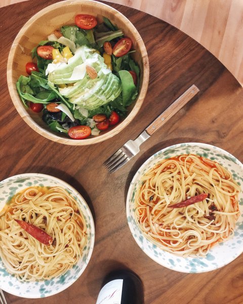 그것만 먹기 섭해서 아보카도 샐러드와 고추기름 파스타를 곁들어서 먹엇어요 배뻥