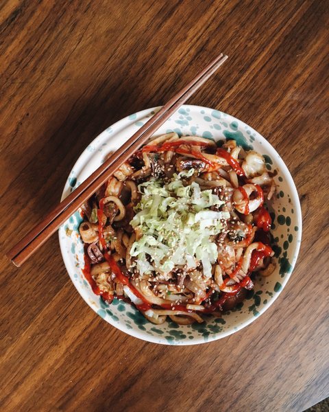 여전히 너무 많이 남은 새우와 오징어로 오늘은 매콤한 해물볶음 우동을 해봤어요