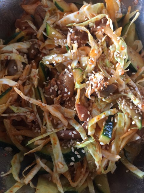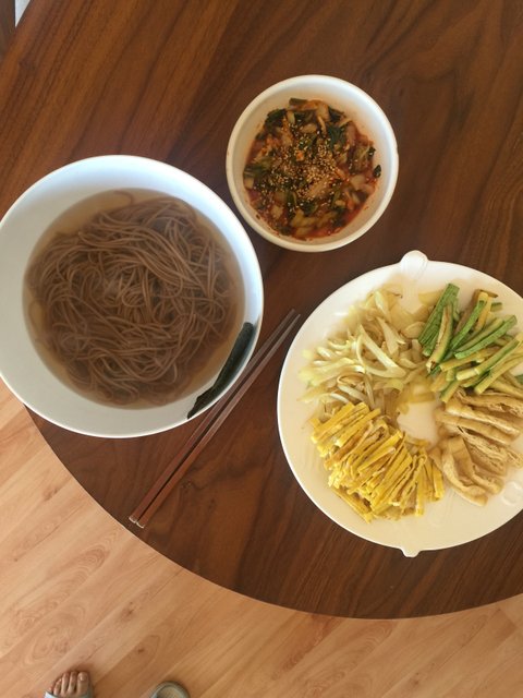 대충 쓱쓱 잘라서 볶아서 메밀잔치국수 대령해봤어요
