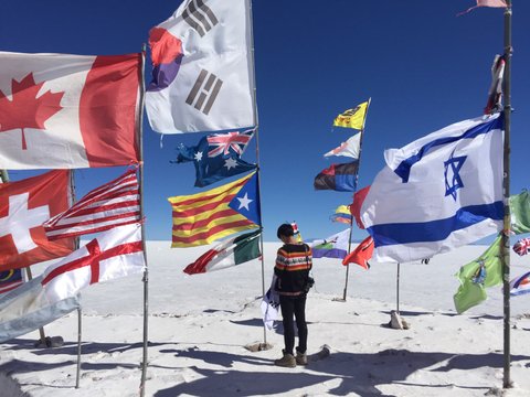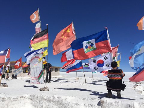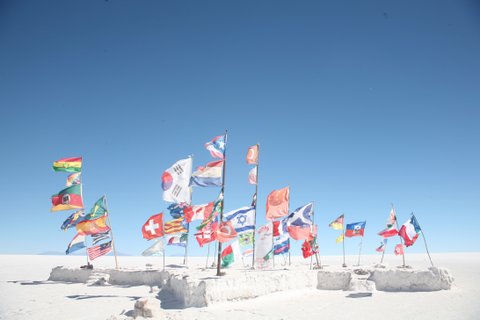 우유니 사막으로 들어가던 중, 다양한 국가의 국기가 한 곳에 꽂혀있는 장소가 있었어요. 그 중 가장 큰 국기는 태극기였는데, 어쩐일인지 높이 달린 태극기가 반으로 찢어져 있었어요.