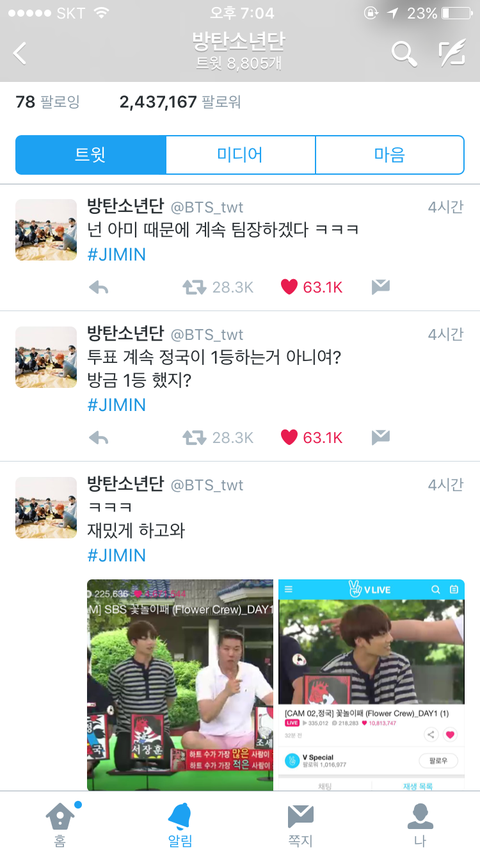아가 방송하는거 지민어머니가 다 봄.