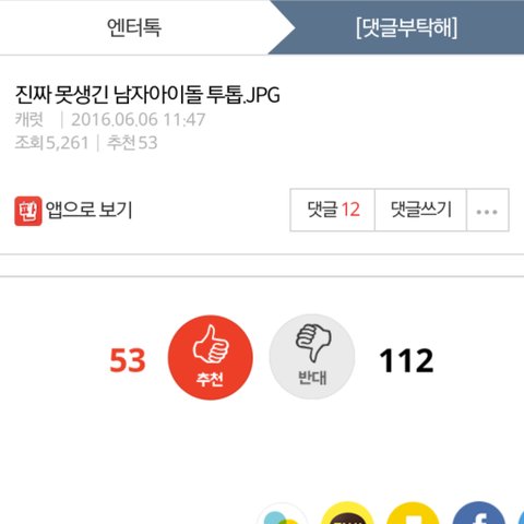이런글도 있었음ㅋㅋㅋㅋㅋㅋ 아니 지는 얼마나 잘났길래 남의 얼굴가지고 이런글 싸지르고 다님? 깔게없어서 외모로 까나; 팬들한테는 한없이 잘났고 소중한 내가수들인데 얼굴로 폄하하는거 ㄹㅇ극혐 거기다 추천수도 극혐 나도 그냥 여러가수 가볍게 파고다니는 라이트팬인데 쟤네 한번도 못생겼다고 생각해본적 없음