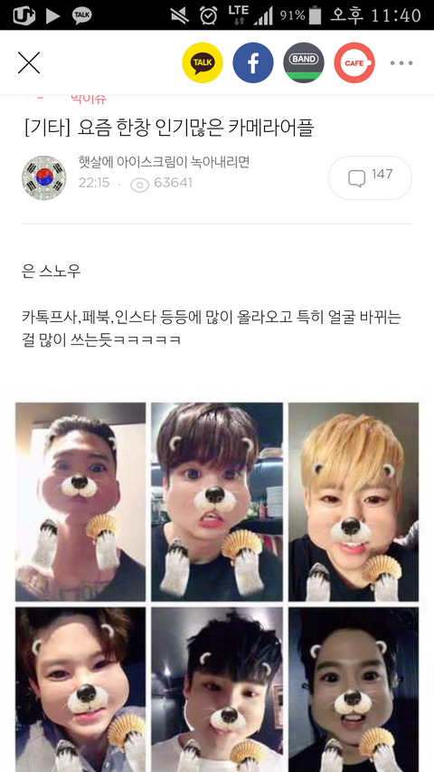 에 스노11우캠 동물이랑 합성되는거 필터쓴 연예인들모아논거있는데