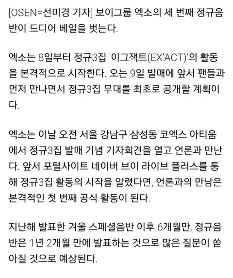공지바꾸자)엑소, 오늘부터 정규3집 활동 스타트..가요계 평정하나 (출처 : OSEN | 네이버...