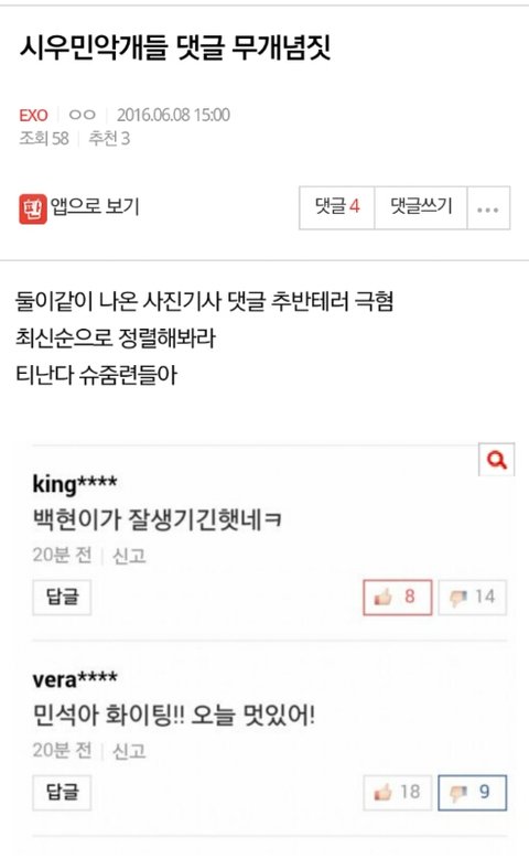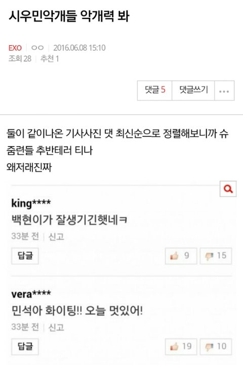 백현팬이 시우민팬깔려고 캡쳐해온건데 백현댓글은 찬성누르고 시우민댓글은 반대누른 백현악개라는거 걸림