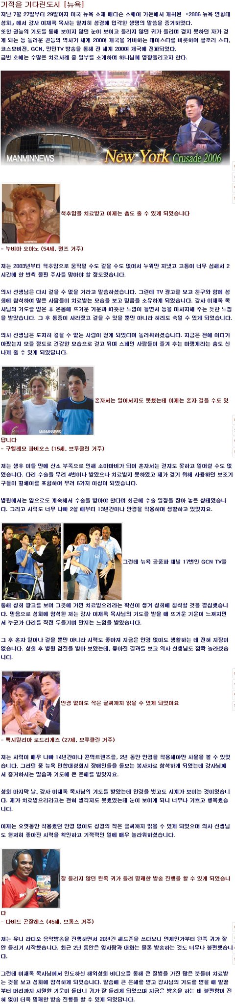 지난 33년간 살아계신 하나님께서는 만민중앙교회 목자! 당회장 이재록 목사님을 통하여 수만은 예언의 말씀을 주셨는데, 심지어는 이땅의 앞으로의 3대 대통령과 “고”김대중 대통령이 탄 비행기가 평양 공항을 이륙 하자 마자 즉시로 지하벙커 에서 열린 비밀 회담의 내용 까지도 자세히 말씀해 주셨다. 그러므로 만민을 통하여 선포 되는 말씀이 틀린다는 것은 전혀 불가능한 일임을 분명히 밝혀 둔다. 수많은 오해와 모략 속에서도 모든것을 이기고 수백만~수천만명(추산)의 병자를 치료 하였고 수억명의 우상 숭배자들을 기독교로 개종 시키는 전무후무한 폭발적인 세계선교를 이룬것은 성경 신구약 전체에 나타난 모든 권능과 기사와 표적의 1000배 이상의 권능과 표적과 기사가 당회장 이재록 목사님을 통하여 나타났기 때문이다. 이와 같은 놀라운 하나님의 교회를 잘 알지도 못하면서 2단, 3단이라 하며 심히도 성령을 해방 했든 수많은 자들이 잘못 되는것을 무수히 보았고 지금도 보고 있다.......... 지금도 전세계 100개국 이상의 나라가 만민을 초청 하고 있다!