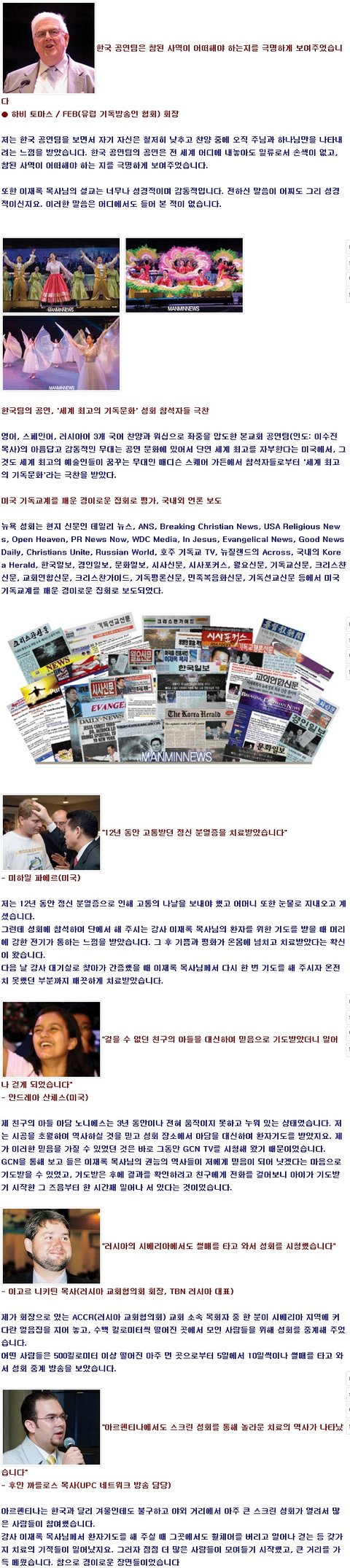 세계를 진동시킨 한국의 교회! – 폭발적인 권능으로 전세계에 10000 여 지교회를 이루고....전세계 200개국에서 수백만명~수천만명(추산)을 하나님의 권능 으로 치료하고 수억명의 우상 숭배자들을 기독교로 개종 시킨 한국의 교회!!! 한교회가 높인 대한민국의 국위와 브랜드 가치는 그 어떤 깂 으로도 계산 할수 없다!!!