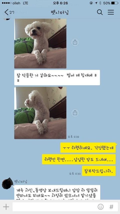애견호텔링에는 별로 좋지 않은 기억들이 많아서.. 이번에 처음으로 펫시터를 이용해보기로 했음. 페시터 검색하니까 겁나 정보가 많았음... 여기 저기 자문을 구하다가 마음에 드는데 발견, 바로 예약 고고함.