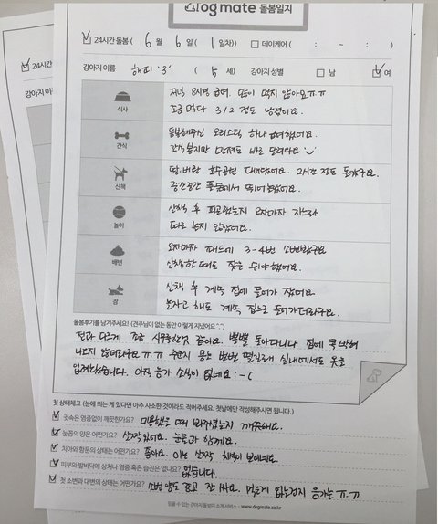 **가장 먼저 마음에 들었던 것**1. 사전미팅을 통해 예약 전 미리 펫시터를 만나보고 예약을 확정할 수 있음2. 하루에 무조건 한마리씩만.. 돈 벌려고 하는 분이 아닌거 같아서 신뢰 팍팍감..3. 전문 교육도 받으신 분4. 육아일기와 같은 강아지 '돌봄일지'를 날마다 작성해줌...(이거 최고)5. 하루 1회 산책, 카톡으로 영상 및 사진 공유, 원하면 영상통화도 가능하다고 해주심... 친절...6. 후기 6개정도 있었는데 후기가 정말 다 좋았음..극찬의 극찬들...