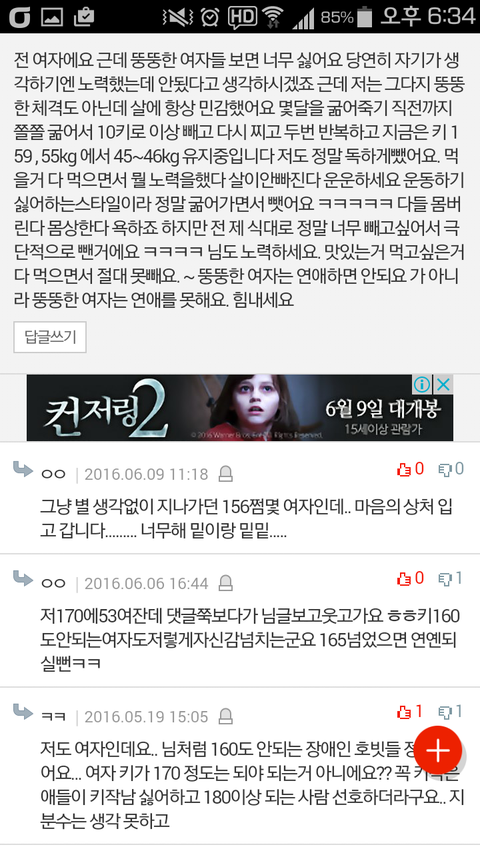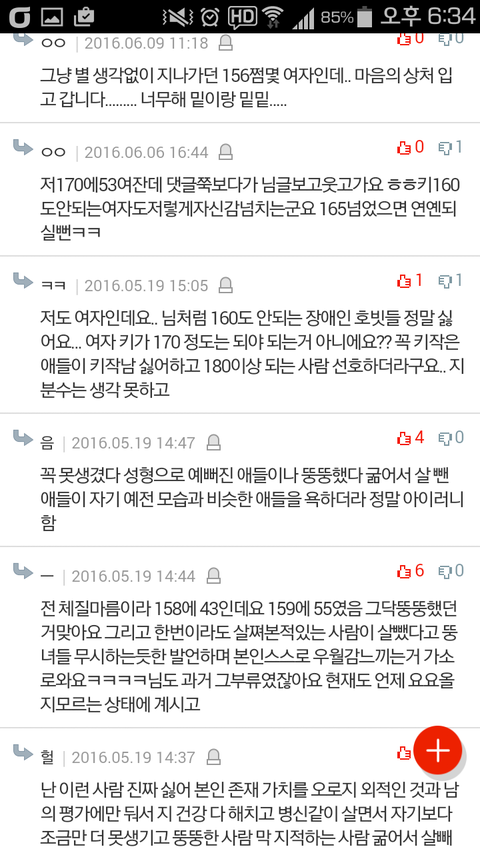 "저도 여자인데요.. 님처럼 160도 안되는 장애인 호빗들 정말 싫어요..여자 키가 170정도는 되야 되는거 아니에요?"(사진 참고해주세요)