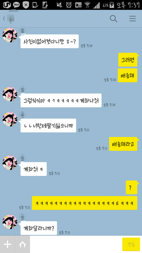 제가 친구랑 인스 산다고 스쉐에서 찾다가 젤많이보이는 이름이 있길래 이사람 괜춘한가보다 하고 주문했는데 4월달에 주문했는데 6월이 다와가는데도 안오는거에요 처음에는 저기 중간고사라고 기달려달라해서 좀 기다려줬는데 솔직히 돈을 줬으면 중간고사 끝나고 바로 배송 시작해야하는거 아니에요? 걍 ㅈㄴ 한달지나서 배송보냈냐고 영수증 보내달라고하니깐 공지확인하세요 이ㅈㄹ하는거에요 그래서 영수증사진 올라왔길래 좀만 기다리면 오겟다 하고 또 1주일 기다렷는데 안와서 배공보내겼어요?분실된건가요?이래보내니깐 바로 답장도 없고 이틀지나서 앗 혹시 이거이거 시키셨어요?이거 아직 발주완료가 안된상태여서요 라고하는거에요 말이 되여? 일주일전에 보냈다면서 그래서 아 ㅈㄴ 사기아닌가 라는생각들어서 그 년한테 친구가 따졌더니 죄송하다는기미 하나도 없이 환불해줄테니깐 돈받아가라는씩으로말하는거에요 와 진짜 사람안빡치겠냐고요 ㅈㄴ 기다린 시간이 얼만데사과먼저해야하는게 상식아닌가요? 걍 너무 싸가지 없어서 친구가 반말까고 욕하니깐 자기도 어이없어 하더라고요 걍 요즘 이런 사기꾼들 많아요 인스사는사람들 진짜 조심하세요 저뿐만이아니고 이사람한테 당한사람이 한둘이 아니더라고요 진짜 너무 억울해서 친구랑 올립니다 하아.... 진짜 빡친다