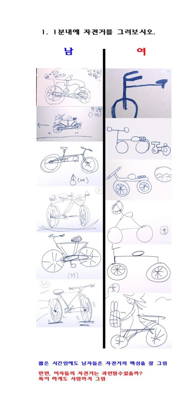 남자는 그림실력과 관계없이 자전거가 돌아가는 원리를 파악하여 구조적으로 그린반면