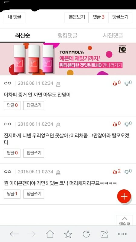 저글쓴지 1분도 안되서 댓글 3개 촤라락달림 저건 거의 여기 상주해있다가 댓다는수준인데? 지금까지 까글쓴거 누군지 증명해주는꼴이네ㅋㅋㅋ 멍청