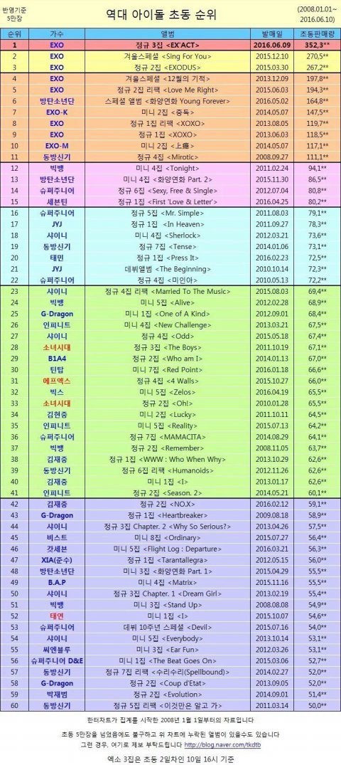 엑소도 방탄도 동방도 세븐틴도 소녀시대도 진짜 조카 대단한 듯.... 사실상 저기 이름 올라간 가수들 다 대단한거지만 저 다섯그룹은 진짜 음반으로 못 까는 수준 아님? 엑소는 발매 3일 됐는데 벌써부터 1위 찍고 있고 방탄이랑 세븐틴은 대형도 아닌데 어째 저리 많이 팔아치우냐.... 동방은 무슨 2008년에 발매했는데 초동이 11만장이 나옴? 소녀시대는 걸 그룹 중에 원탑인 듯 ㄹㅇ 어떻게 솔로도 올라가냐 진짜 개대단