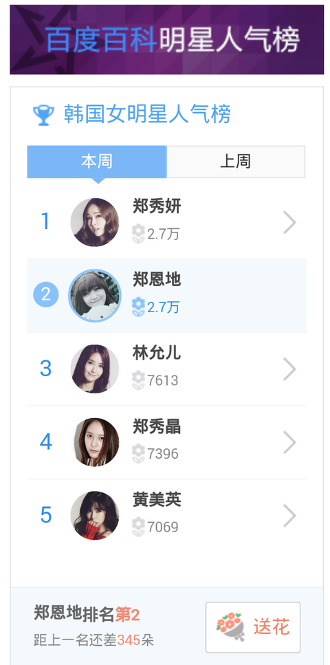 이번주 바이두 한국여자아이돌 꽃송이투표