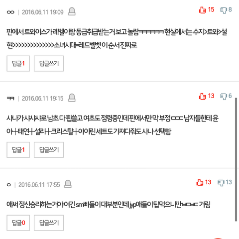 수지때부터 붙어온 jyp안티 호줎이짓임 그리고 맨날 이런글볼때마다 느끼는건 여기다 추천 누르는애들도 아닌거알면서 선동하는거 웃김 우리도 판에서 언급된는거싫어 한달동안 트와이스 까글 톡선안간날이 없는데 칭찬글도 반대폭탄먹고 근데 갑자기 jyp팬들이 어디서 그렇게 나타남?? jyp까는글에는 추천수 어마어마하던데