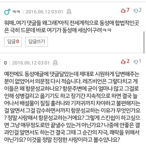 사실 나는 동성애에대해 아무생각이없었어 너희들이랑 똑같은 생각이었지 근데 얼마전에 톰과제리 동심파괴?그 글을보다가 동성애에대한얘기가 나와서 관심을갖고 조사해보다가 충격을받게됐어