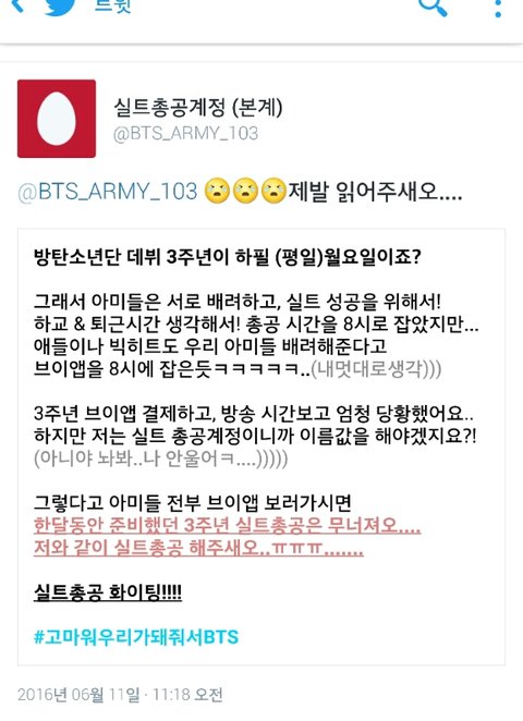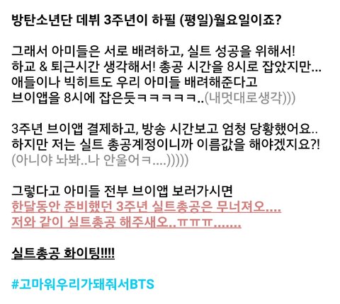 나도 애들 3주년 태태앱 결제해서 고민했지만 실트 총공을 하기로했어. 저 실트총공 공지가 많이 알려졌다 해도, 분명 많은 팬들은 태태앱을 볼걸 알기때문이야.