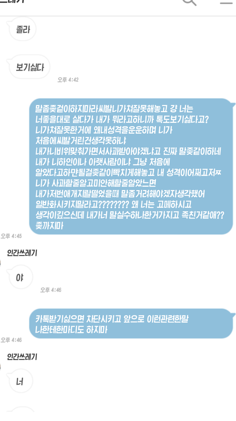 저도 지지않고 몹시 욕하고 싸웠지만 동생은 저일에대해서도 제가 정신병자라서 자기 일하는데 며칠이나 지난 그시점에 제가 그냥 생각나서 카톡우로 화를 냈답니다.