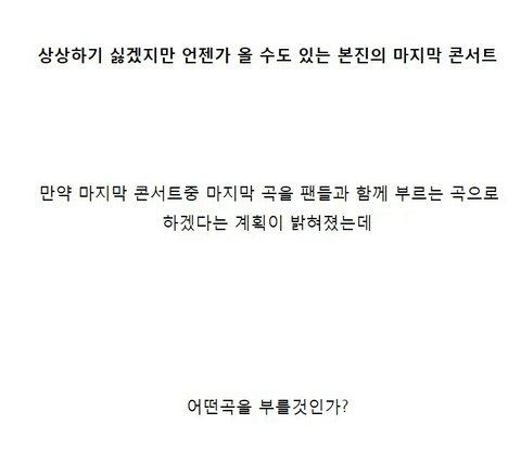 짹보다가 가져왔어 ㅠ 마지막콘서트라니 슬프다.. 우리 캐럿들은 마지막콘서트라면 마지막곡 뭘로 할꺼야? 나는 지금으로썬 사랑쪽지... 진짜 다같이 떼창하면서 엉엉 울듯.. ㅊㅊ ㅇㅅㅌㅈ
