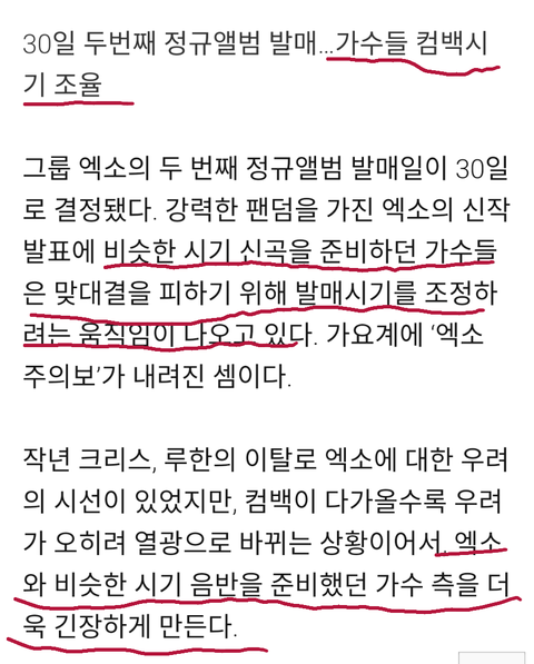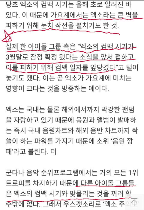 엑소 컴백 찌라시 뜨면 sm에 전화해서 확인하고 가수들 컴백 날짜 조정하는 타소속사들 많아~