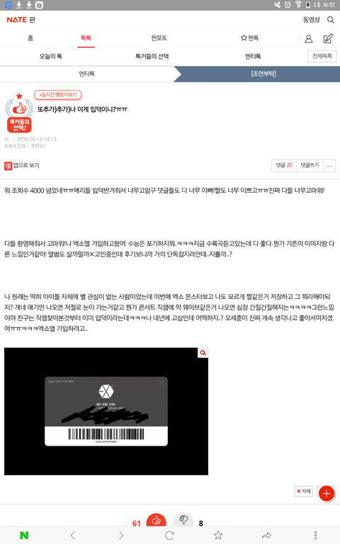 다들 환영해줘서 고마워!!나 엑소엘 가입하고왔어! 수능은 포기하지뭐..ㅋㅋㅋ지금 수록곡듣고있는데 다 좋다..뭔가 기존의 이미지랑 다른 느낌인거같아! 앨범도 살까말까ㅈ고민중인데 후기보니까 거의 단독잡지라던데...지를까...?