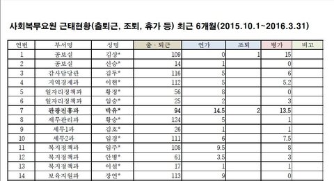 강남구청의 '사회복무요원 근태현황,(2015년 10월1일~2016년 3월31일) 자료. 7번 항목이 박유천 씨의 근무 현황이다. 박씨는 연가나 병가로 30일을 사용했으며, 이는 전체 복무기간 중 25%에 해당한다. 이는 같은 기간 강남구청 소속 공익근무요원 66명 가운데 가장 높은 수치다.