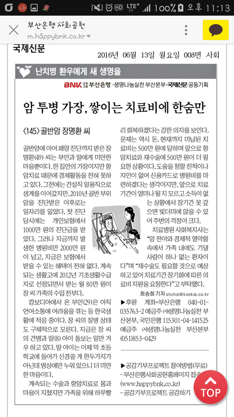 댓글 응원해주시면 암투병중인 장명환씨께